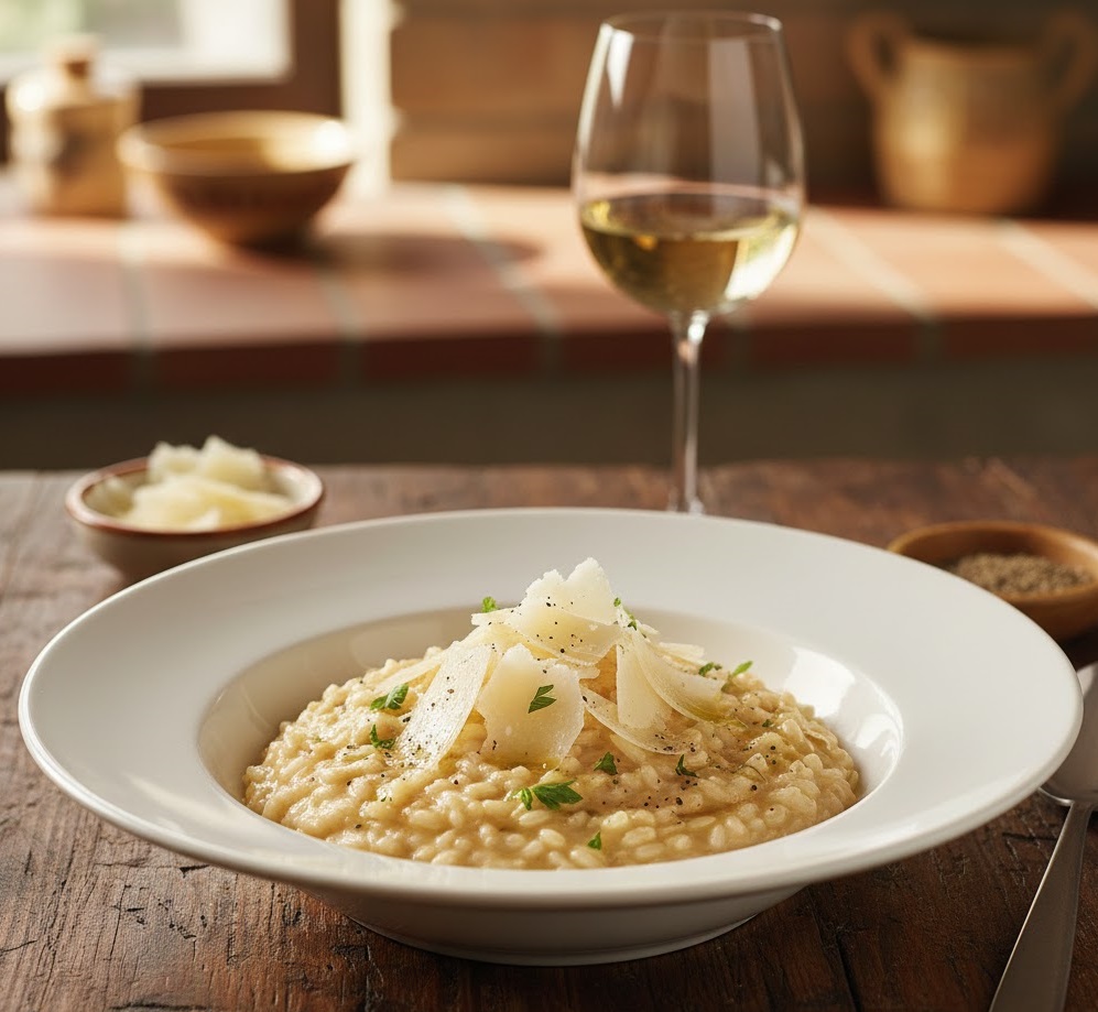 Le parmesan apporte le sel, la profondeur, l’umami. Il structure la crème et prolonge la saveur du riz. C’est lui qui donne cette longueur en bouche si caractéristique, presque addictive.
