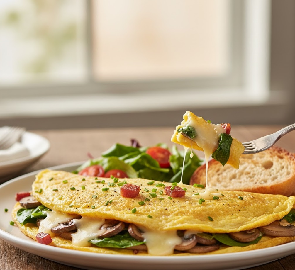 Le moment crucial arrive lorsque l’omelette est presque cuite mais encore légèrement crémeuse. C’est là qu’on ajoute les garnitures si on le souhaite, puis qu’on replie délicatement. Trop cuite, elle devient sèche. Pas assez, elle reste liquide. Trouver l’équilibre, c’est ce qui fait toute la différence.