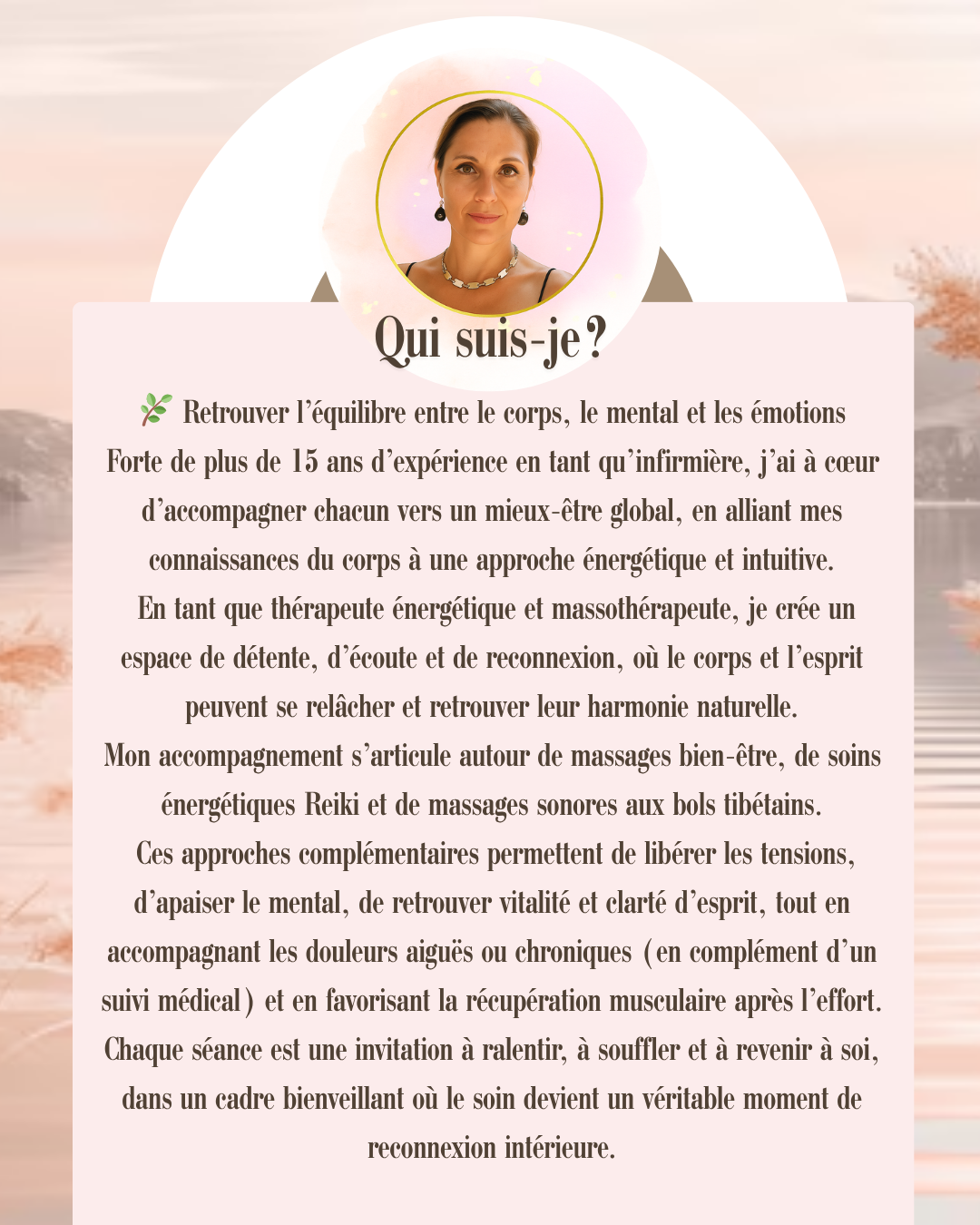 thérapeute énergétique et massothérapeute, et j’accompagne celles et ceux qui souhaitent retrouver un équilibre harmonieux entre le corps, le mental et les émotions.